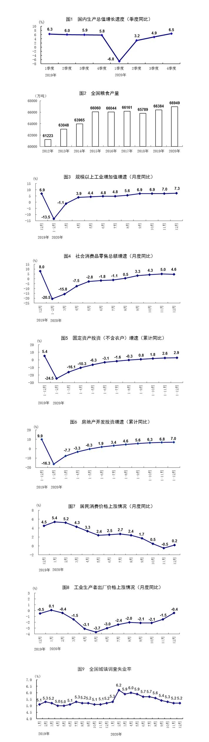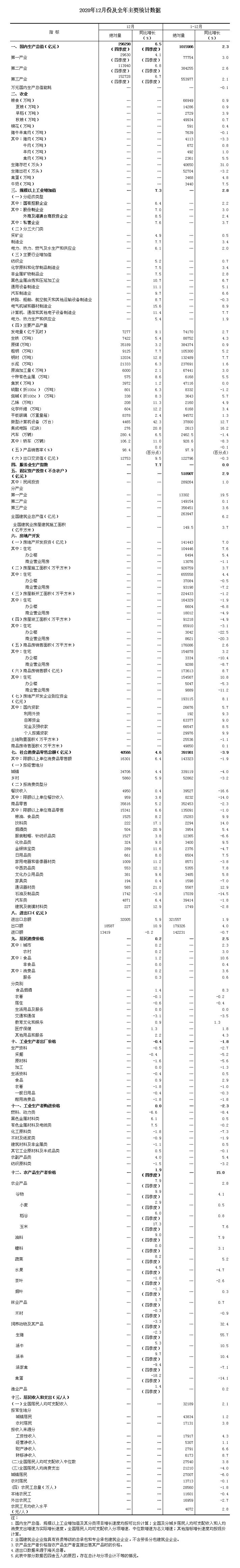 总的来看,2020年国民经济运行稳定恢复,稳就业保民生成效显著,决战脱贫攻坚取得决定性胜利,“十三五”规划圆满收官,全面建成小康社会胜利在望。同时应看到,疫情变化和外部环境存在诸多不确定性,我国经济恢复基础尚不牢固。下一步,要以习近平新时代中国特色社会主义思想为指导,全面贯彻落实党的十九届五中全会和中央经济工作会议精神,坚持稳中求进工作总基调,立足新发展阶段,贯彻新发展理念,构建新发展格局,坚定不移深化改革开放创新,巩固拓展疫情防控和经济社会发展成果,扎实做好“六稳”工作、全面落实“六保”任务,科学精准实施宏观政策,努力保持经济运行在合理区间,确保“十四五”开好局、起好步。
