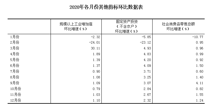 (2)根据季节调整模型自动修正结果,对近一年来各期国内生产总值、规模以上工业增加值、固定资产投资(不含农户)、社会消费品零售总额环比增速进行修订。修订结果及2020年四季度GDP环比数据、2020年12月份其他指标环比数据如下: