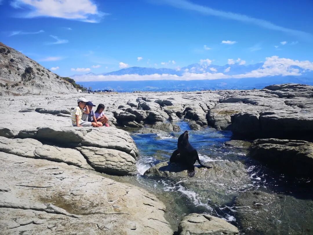这里是位于新西兰南岛沿滨小镇凯库拉的海豹栖息地,孩子们和这只刚游上岸晒着太阳的海豹,共同享受着同一片蓝天,大自然和野生动物们在这里受到了极大的尊重和保护。疫情过后,欢迎大家到新西兰来一场纯净之旅。