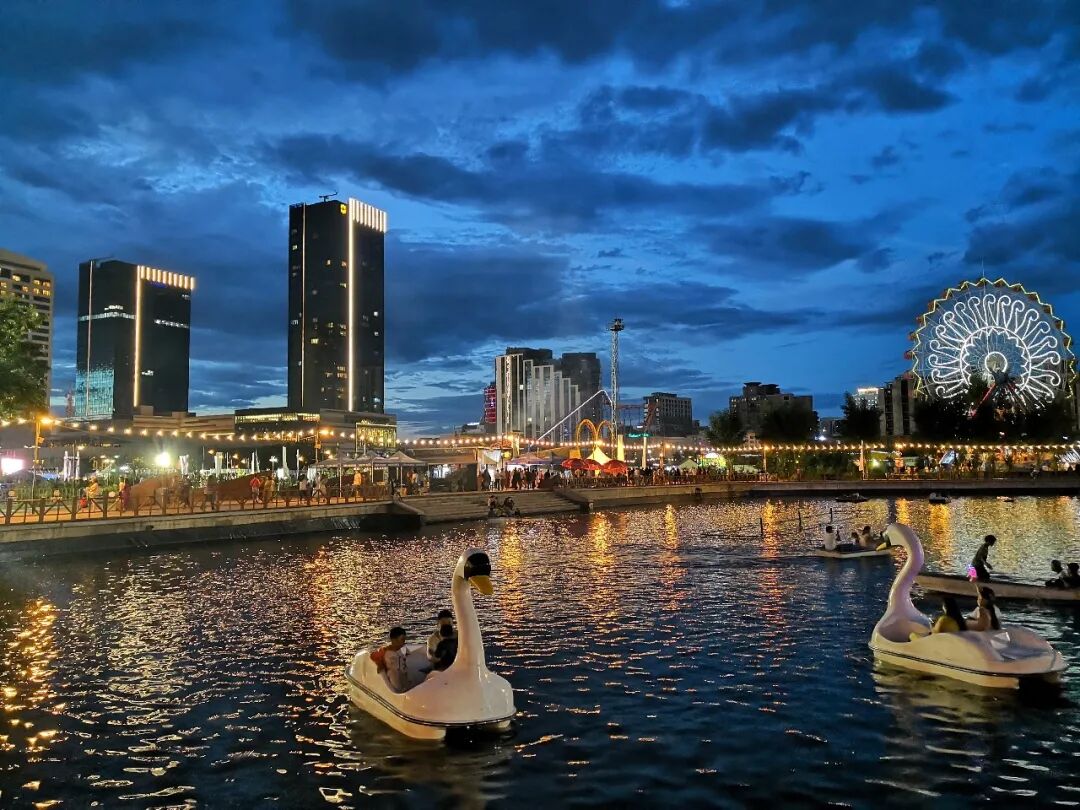 这是蒙古国乌兰巴托市中心的大型公园游乐场。街灯点燃城市的傍晚,相约的人们心情沉醉,幽会的恋人好不浪漫,草原的子民享受着无忧无虑的生活。疫情后,欢迎您来蒙古国。