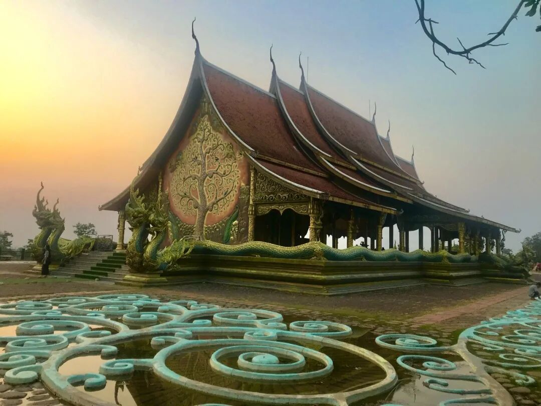 这里是泰国东北部乌汶府Phu Prao山顶上的一座寺庙,有一幅用夜光颜料绘制的巨大菩提树壁画,入夜后便绽放出绿色荧光,与地面上绽放的花朵图腾交相辉映,让整座寺庙显得无比奇妙美丽,当地人称它为“荧光寺”。同时,由于地处东部高山顶,这里也是泰国“赏日出”、“迎曙光”最好的地方。疫情后,欢迎您来泰国。