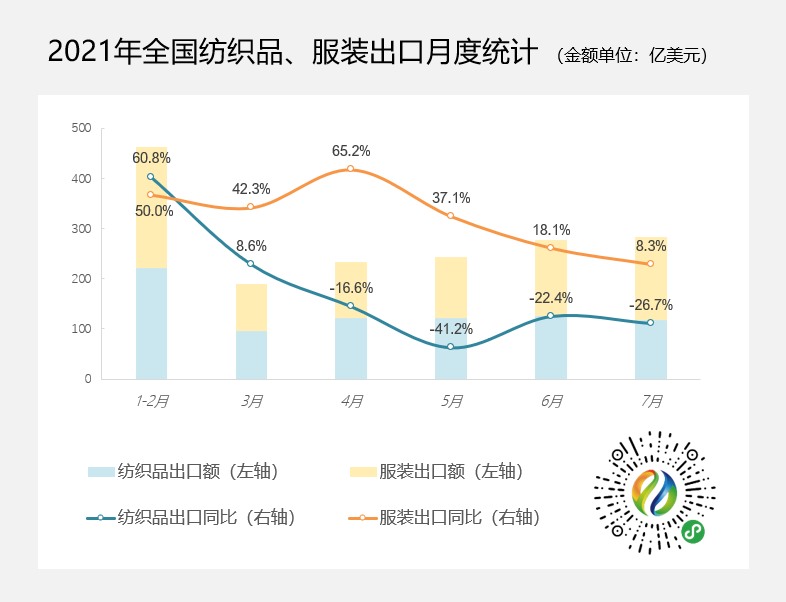快讯丨1-7月全国纺织品服装出口1684亿美元,同比增长7.7%