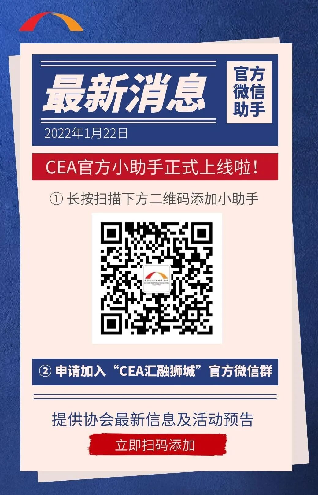 为服务中新经贸交流,助力企业宣传推广,协会继推出会员服务小程序外,现特别推出CEA官方小助手,帮助企业推送各类经贸服务信息,欢迎大家扫码加入。