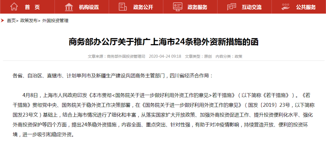 4月21日,商务部发了个通知,决定将上海稳外资的24条措施向全国推广。(点击“阅读原文”可查看完整版上海市稳外资新举措)